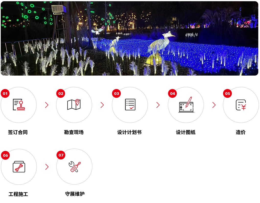 公司設(shè)計團(tuán)隊集合多年國際上新的設(shè)計理念、運(yùn)用燈光科技,將制作精巧、創(chuàng)意絕倫的彩燈通過傳統(tǒng)與時尚、文化與生態(tài)的結(jié)合,讓彩燈這傳統(tǒng)文化更富有視覺沖擊力和感染力。
