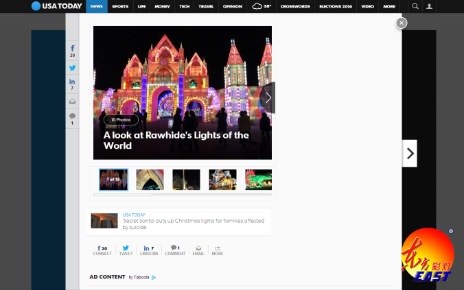 我公司赴美舉辦的“2016世界之光——彩燈嘉年華”自開展以來備受美國當(dāng)?shù)孛癖姛崤鹾透鞔笾髁髅襟w關(guān)注,燈展被美國第二大報紙、全美的彩色全國性英文對開日報《今日美國》評選為今年“全美圣誕燈飾十大觀賞地”之一。