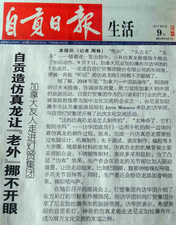 為進(jìn)一步擴(kuò)大中加雙方經(jīng)貿(mào)往來(lái)和人文交往,推進(jìn)“2018中加旅游年”的交流合作。受四川省人民政府邀請(qǐng),尼亞加拉瀑布市政府訪問(wèn)團(tuán)一行7人于9月7日-9日到自貢燈貿(mào)集團(tuán)、四川藝思特彩燈文化傳播有限公司進(jìn)行訪問(wèn)考察。