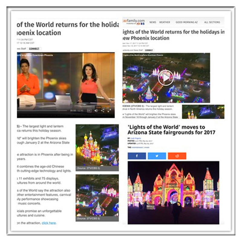 開幕式上菲尼克斯印第安原住民、拉丁裔、華人、墨西哥等各族裔文化藝術(shù)團(tuán)體表演了豐富多彩的歌舞節(jié)目,展示了菲尼克斯多元文化風(fēng)采。瑰麗的花燈、燦爛的民間藝術(shù)和強(qiáng)大的演出陣容,園內(nèi)數(shù)千名美國觀眾無不歡呼雀躍、拍手稱奇。美國亞利桑那州各大主流媒體、華人媒體全面采訪報(bào)導(dǎo)了燈會開幕式盛況。菲尼克斯當(dāng)?shù)匦侣劇?Now @ 6 》報(bào)道稱“2017世界之光彩燈嘉年華是北美最大的彩燈節(jié),是全球文化集合地,游客仿佛置身于迪士尼中?!?