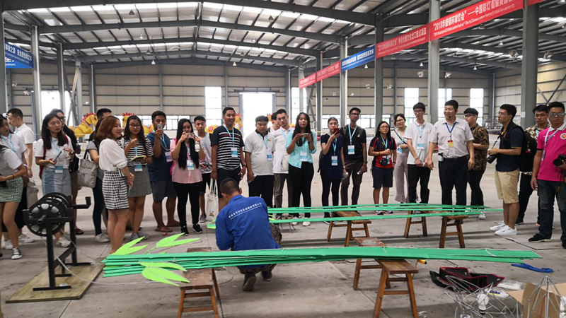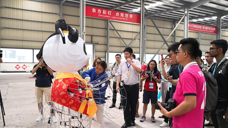 走進(jìn)東方彩燈出口基地,來到“東方彩燈 點(diǎn)亮世界”項(xiàng)目境外燈展制作現(xiàn)場,青年朋友們近距離的詳細(xì)了解了彩燈的制作流程和工藝。交流團(tuán)成員為東方彩燈足跡遍布世界30多個(gè)國家咋咋稱奇,為燈貿(mào)集團(tuán)精妙絕倫的彩燈頻頻點(diǎn)贊。
