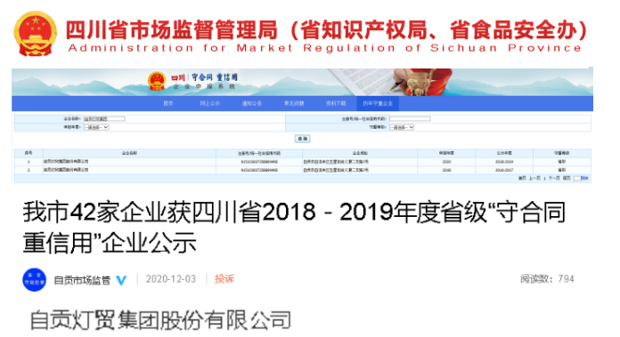 燈貿(mào)集團(tuán)以良好的企業(yè)信譽(yù)和社會(huì)口碑,榮獲四川省市場(chǎng)監(jiān)督局管理局頒布的2018-2019年度四川省“守合同重信用”企業(yè)稱號(hào)。