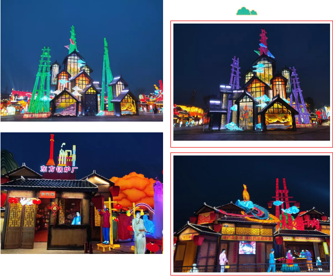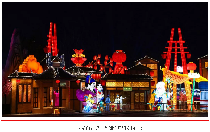 《自貢記憶》主燈組使用傳統(tǒng)材質(zhì)結(jié)合現(xiàn)代工藝,宏偉的天車獨(dú)創(chuàng)性的使用啤酒瓶制作,配合追光變色形成絢麗奪目的燈光效果。顯示屏剪影式表現(xiàn)自貢元素。恐龍穿行、錦鯉游動(dòng),還有靈活靈現(xiàn)的自貢歷史場景和人物,還原了一幅原滋原味又生動(dòng)的老自貢記憶。
