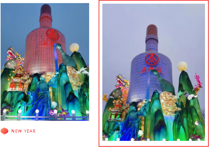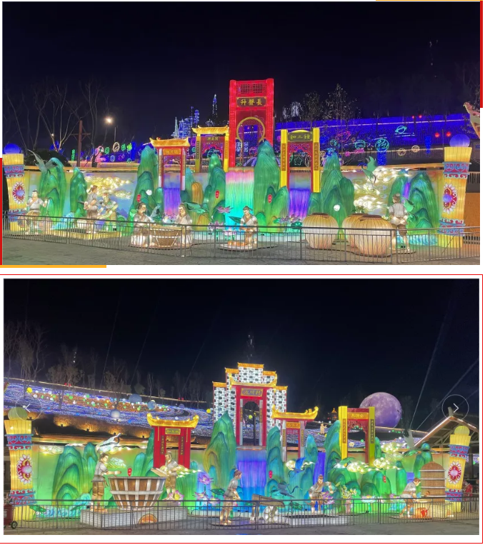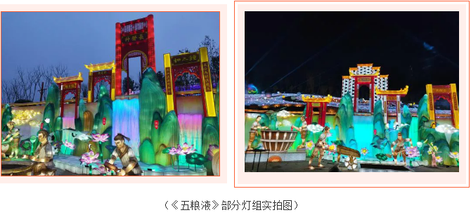 《五糧液》主燈組采用第八代五糧液酒瓶運(yùn)用自貢彩燈傳統(tǒng)工藝?yán)υ删扌臀寮Z液,輔以仙山、仙境、巨龍騰越氛圍闡釋五糧傳奇,杯酒時(shí)光,百年味道。周邊群燈組展示封存在時(shí)光中的“活窖池”--利川永、張萬和、劉鼎興、天賜福、聽月樓、全恒昌等八家明代釀酒作坊,歷史悠久的古窖池群講述著傳承幾百年的五糧液釀酒工藝,折射幾千年氤氳酒香的中國酒歷史和酒文化。