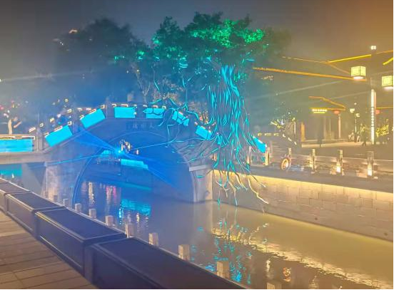 燈貿(mào)集團(tuán)承制的“鹽鎮(zhèn)水街最鹽城”系列彩燈,令游客領(lǐng)略到“夜色闌珊迷人,漿身燈影悠然”的和諧美好繁華景致。華燈搖曳,游人如織,移步天水橋,紡著潺潺夜色,一式的明清風(fēng)味的青磚黛瓦樓閣,夜幕下燈火璀璨。