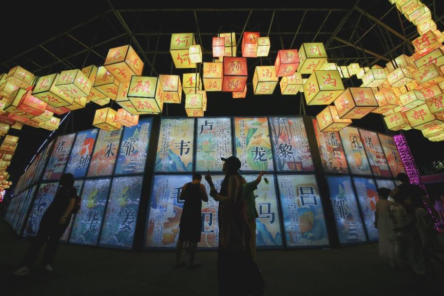 本次燈會(huì)刮起濃濃“國(guó)潮風(fēng)”。燈會(huì)入口是一座中式建筑風(fēng)格的迎賓門,長(zhǎng)達(dá)50米的迎賓廊道掛滿燈籠,市民游客穿行其間,恍如置身漢唐;十二生肖彩燈俏皮靈動(dòng),精致絢爛;百余句經(jīng)典詩(shī)詞點(diǎn)亮道旁樹木;百家姓燈籠組成長(zhǎng)龍,中華傳統(tǒng)文化韻味十足。